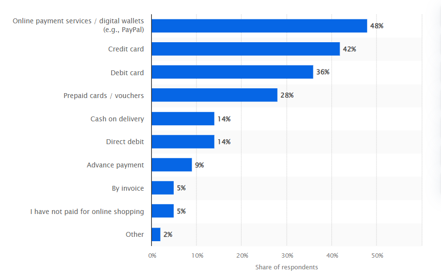 Mentre a livello globale tra i metodi più utilizzati si posizionano PayPal e la classica carta di credito, con percentuali rispettivamente del 48% e 42%. Il terzo metodo di pagamento più utilizzato è quello delle carte di debito.